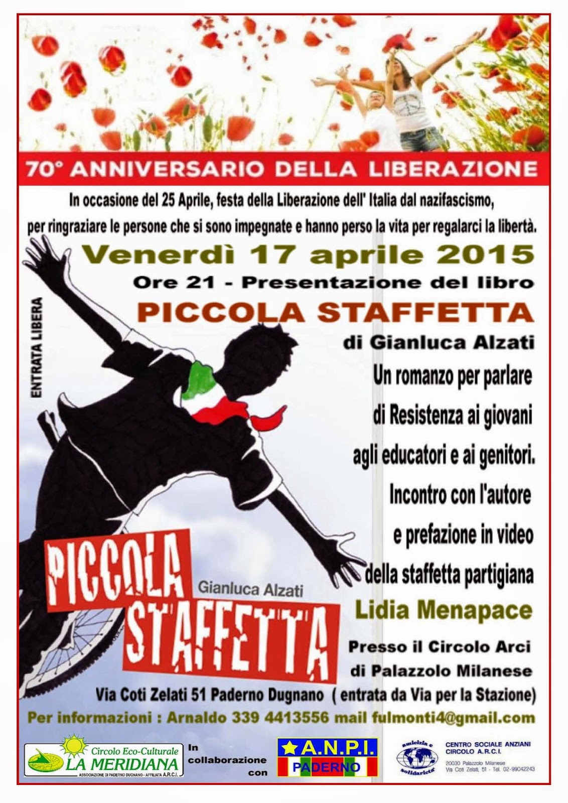 Il Circolo Eco-Culturale La Meridiana di Paderno Dugnano, in collaborazione con la Sezione ANPI Angelo Cazzaniga di Paderno Dugnano e al Circolo ARCI di Palazzolo Milanese in occasione del settantesimo anniversario della Liberazione (25 aprile 1945 – 2015), invita i cittadini e in particolare, i docenti, gli educatori e i genitori, alla presentazione dell'ultimo romanzo del prof. Gianluca Alzati dal titolo: “Piccola staffetta” (Bellavite editore).